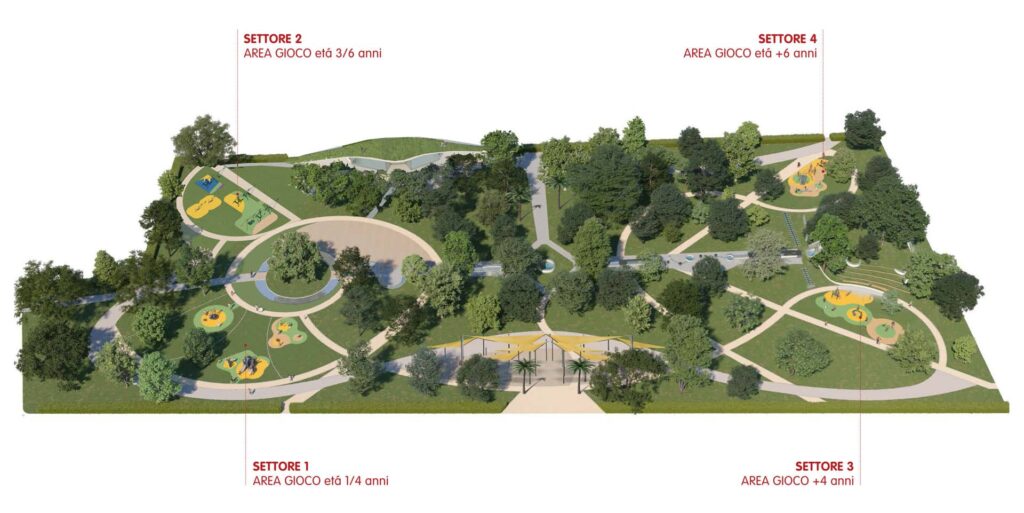 Zone gioco: le quattro zone gioco, differenziate per età, sono state mantenute e adesso sono dotate di nuovi giochi accessibili, che sviluppano la creatività e le abilità dei bambini e permettono loro di interagire in diverse modalità ed è stata realizzata una speciale pavimentazione di gomma colata anti shock a garantire sicurezza ed inclusività.